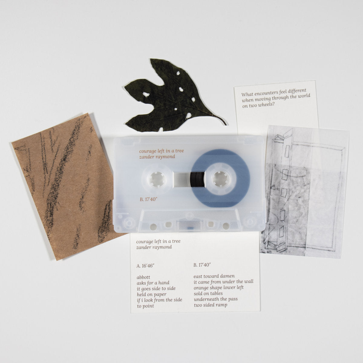 Chicago-based Zander Raymond takes us on a reflective ride with 'courage left in a tree', an album inspired by the sonic and physical experience of travelling by bike throughout a metropolitan landscape in winter, yearning for the sensation of an August sun. The track titles reference sites and geographic points stumbled upon during his daily commutes to and from work, while the sounds heard throughout speak to a deeper personal process for Zander: “I am very sensitive to sound, so I turn to field recorders to capture the unpleasant, and I weave those into compositions in an attempt to understand them, but also as a way to make them beautiful.” Keyboards, field recordings, and modular synthesizer bring to life sounds found and made, where solid forms and sonic waves co-create in harmony.